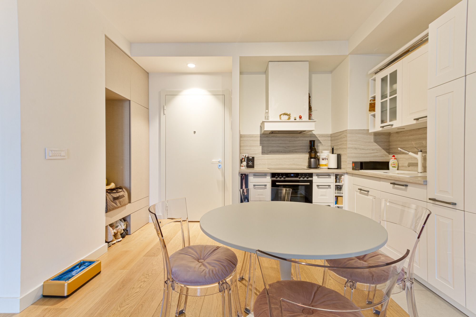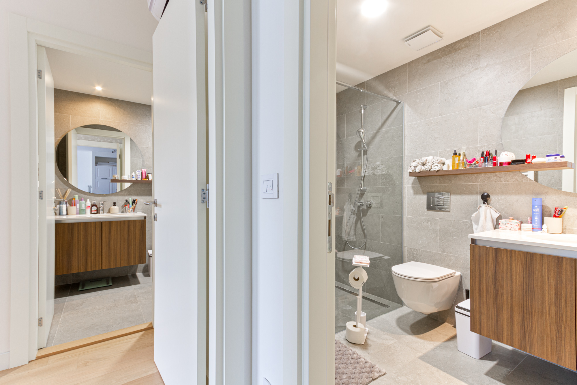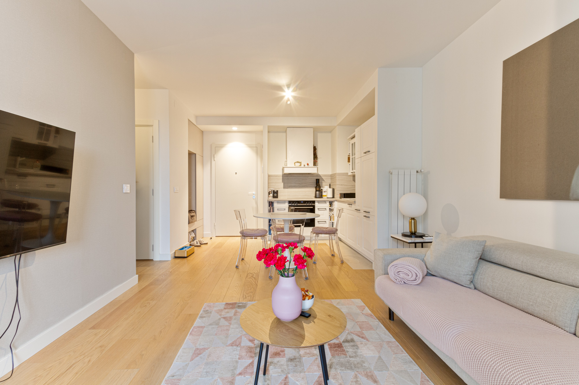 Raspored sa dve spavaće sobe i dva kupatila pruža nivo komfora idealan za porodičan život, ali i za one koji cene funkcionalnost i privatnost u savremenom urbanom okruženju. Terasa je pozicionirana ka unutrašnjem dvorištu, sa prijatnim pogledom na zelenilo, što obezbeđuje mir i privatnost u svakodnevnom boravku.