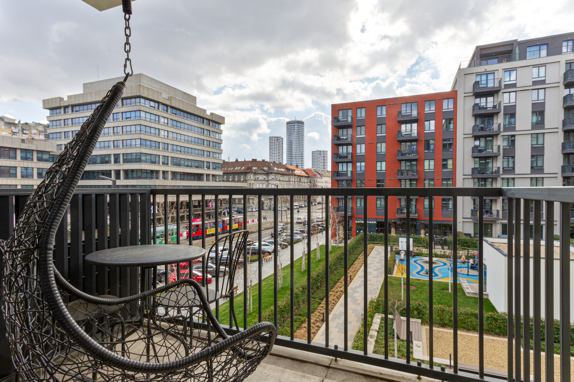 Posebnu vrednost daje terasa iz dnevne sobe, sa pogledom na tiho, uređeno unutrašnje dvorište, uz diskretan panoramski pogled ka Starom gradu — savršen balans urbanog života i privatnosti.
